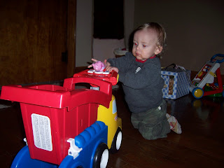 We got the box of toys from his birthday last Friday and it couldn't have come at a better time. One of his favorite things is the dump truck that Peep got him. He loves to walk with it but he really likes to fill the back of the truck with other toys and then take them out so that he can put them back in again.